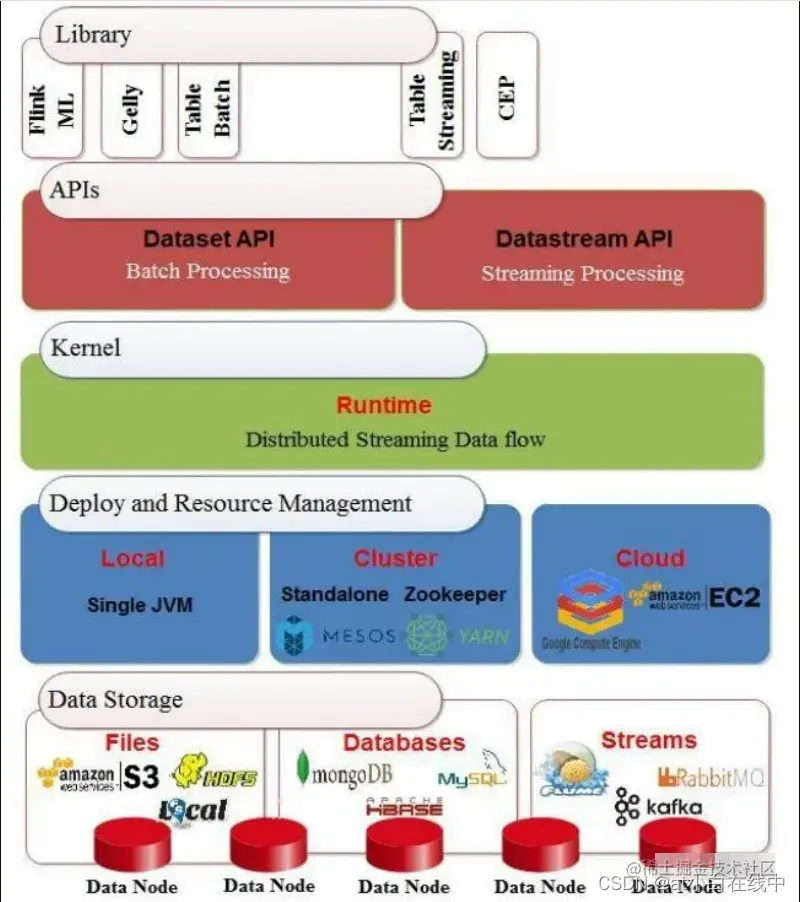 图6展示了Flink的体系结构。在基础层中,存储层可以从多个目标(例如HDFS,本地文件等)读取和写入数据。然后,部署和资源管理层包含用于管理计划任务,监视作业和管理资源的群集管理器。该层还包含执行程序的环境,即集群或云环境。同时,它还支持单个Java虚拟机的本地部署。