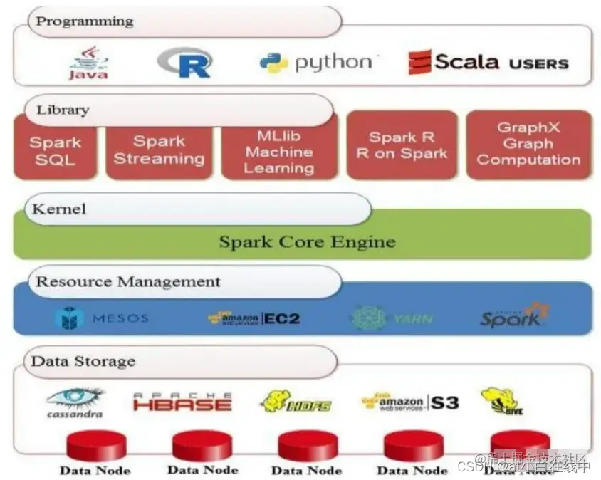 图3表示Spark架构,它非常容易且快速地选择大量数据处理。Spark主要由五层组成。第一层包括数据存储系统,例如HDFS和HBASE。第二层是资源管理;例如YARN和Mesos。第三个是Spark核心引擎。第四个是一个库,由SQL,流处理,用于机器学习的MLlib,Spark R和用于图形处理的GraphX组成。最后一层是应用程序接口,例如Java或Scala。通常,Spark提供了一种大型数据处理框架,供银行,电信公司,游戏公司,政府以及Apple,Yahoo和Facebook等公司使用。