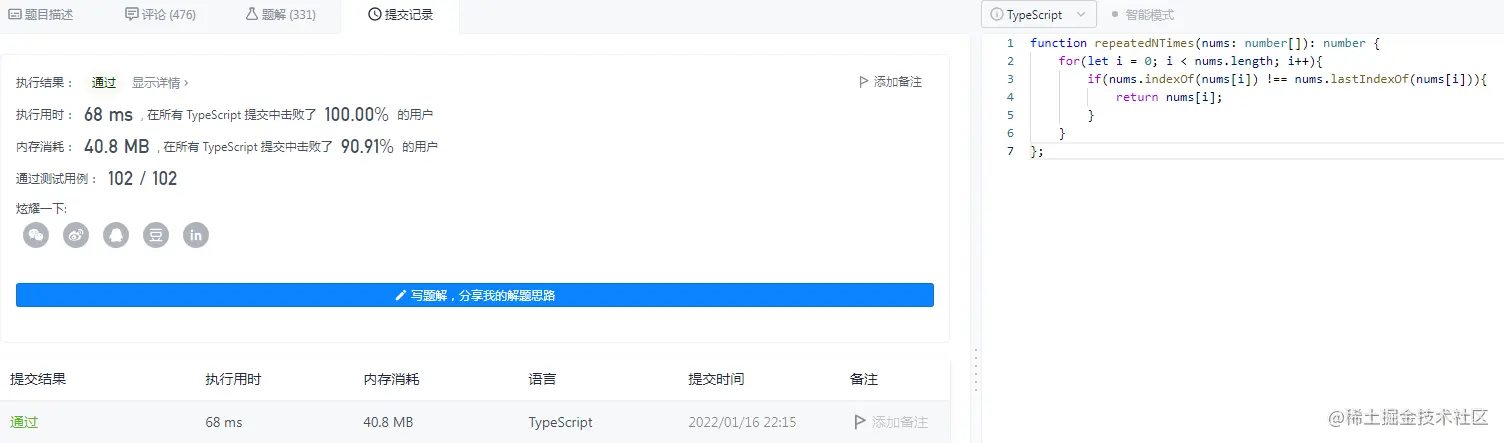 思路:nums.length是 2 * n,数组有 n + 1 个不同元素,需要找到重复 n 次的元素