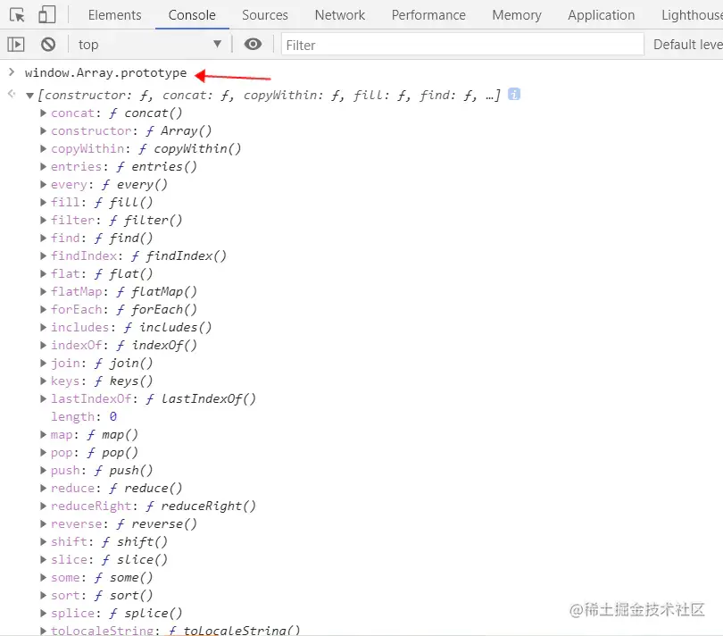 首先请想下你平常写代码数组的常用方法有哪几个,答:map、forEach、concat、some....等等,你有没有想过这些方法从哪里来的? 当然是有人写出来的啊!!!为了方便,提前写好的啊!!! 没错,就是这样的,接下来我们直接浏览器f12看一下数组的其他方法,怎么看?控制台输入下面这段话: