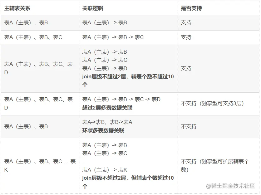 接入开放搜索前,需要预先设计好表结构(可单表,可多表join),以便后期应对各种搜索业务场景和数据推送场景。目前开放搜索支持的多表场景如下: