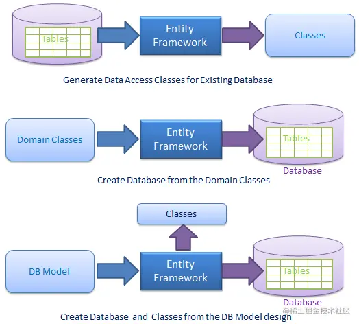 EF有三种使用场景,1. 从数据库生成Class,2.由实体类生成数据库表结构,3. 通过数据库可视化设计器设计数据库,同时生成实体类。