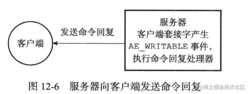 当服务器有命令回复需要传送给客户端的时候,服务器会将客户端套接字的AE_WRITABLE事件和命令回复处理器关联起来,当客户端准备好接收服务器传回的命令回复时,就会产生AE_WRITABLE事件,引发命令回复处理器执行,并执行相应的套接字写入操作,如图12-6所示。