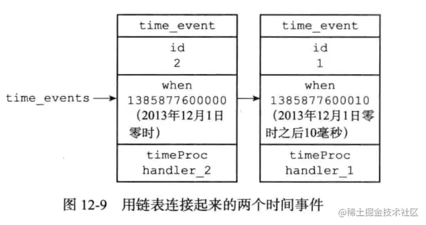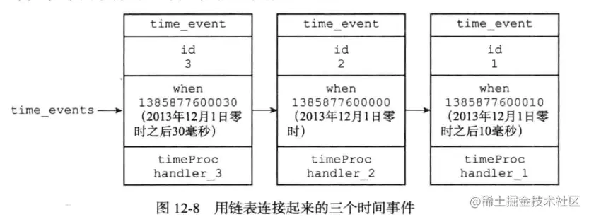 图12-8展示了一个保存时间事件的链表的例子,链表中包含了三个不同的时间事件:因为新的时间事件总是插入到链表的表头,所以三个时间事件分别按ID逆序排序,表头事件的ID为3,中间事件的ID为2,表尾事件的ID为1。