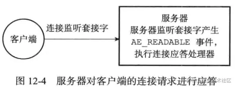 当Redis服务器进行初始化的时候,程序会将这个连接应答处理器和服务器监听套接字的AE_READABLE事件关联起来,当有客户端用sys/socket.h/connect函数连接服务器监听套接字的时候,套接字就会产生AE_READABLE事件,引发连接应答处理器执行,并执行相应的套接字应答操作,如图12-4所示。