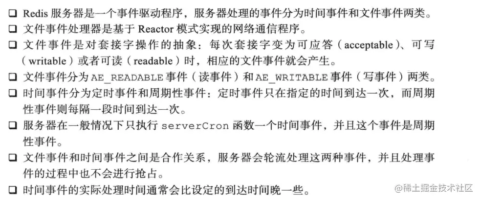 - 因为时间事件在文件事件之后执行,并且事件之间不会出现抢占,所以时间事件的实际处理时间,通常会比时间事件设定的到达时间稍晚一些。