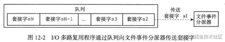 IO多路复用程序负责监听多个套接字,并向文件事件分派器传送那些产生了事件的套接字。I/O多路复用程序总是会将所有产生事件的套接字都放到一个队列里面,然后通过这个队列,以有序( sequentially)、同步( synchronously )、每次一个套接字的方式向文件事件分派器传送套接字。当上一个套接字产生的事件被处理完毕之后(该套接字为事件所关联的事件处理器执行完毕),IO多路复用程序才会继续向文件事件分派器传送下一个套接字,如图12-2所示。