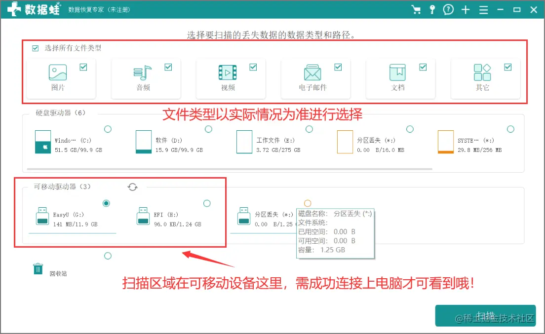 步骤2.由于u盘是中毒原因导致的文件乱码,所以你可以全选想要恢复的文件类型,这样比较妥当,以免错过漏网之鱼;而扫描区域自然就是u盘了,在可移动设备这一块,不过u盘要成功与电脑连接同步才会显示哦!选择好了就可以点击“扫描”等待出结果了;
