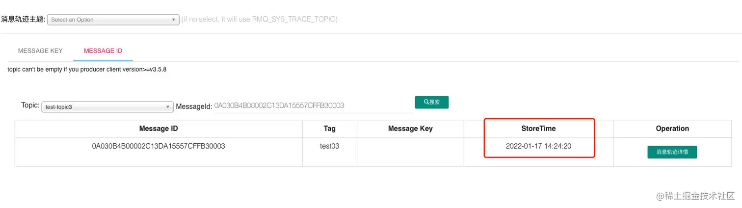 可以先调用 controller 生产消息,或者不用 Demo 中的生产者生产消息,找一个之前发过消息的 topic , 看一下它的消息轨迹,找到存储时间