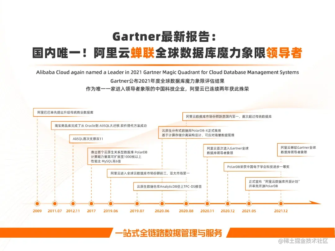 阿里云连续两年入选领导者象限,这代表中国数据库技术水平已跻身世界领先行列,走向国际舞台,并日渐成为这个领域中的领导者。不仅有着重要的现实意义,也为阿里云数据库后续的发展奠定了非常好的基础。