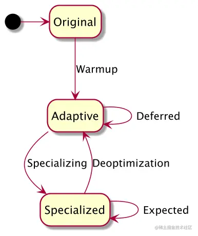 在虚拟机层面,当某个字节码对象 PyCodeObject 被执行(可以简单理解为一段 Python 代码对应的字节码被执行)或是发生绝对跳转时,代码对象的 co_warmup 计数器会被累加,当达到阈值后这段字节码中所有可优化指令都会被替换为 Adaptive 指令进行观察和特殊化,此后这些指令只会在 Adaptive 和 Specializing 之间转换,当 Specializing 指令的优化条件被破坏时,我们不会立即回滚到 Adaptive 指令,而是允许一定次数的 miss 以防止出现优化和去优化之间的颠簸,同样的当去优化回滚到 Adaptive 指令后我们也会暂停观察和优化逻辑,让指令按照原始逻辑运行一段时间,这个过程被称为 deferred,整个过程的状态图如下: