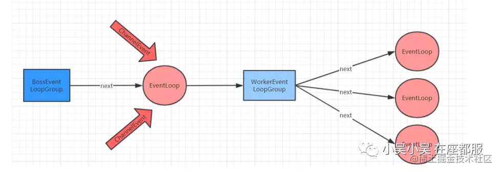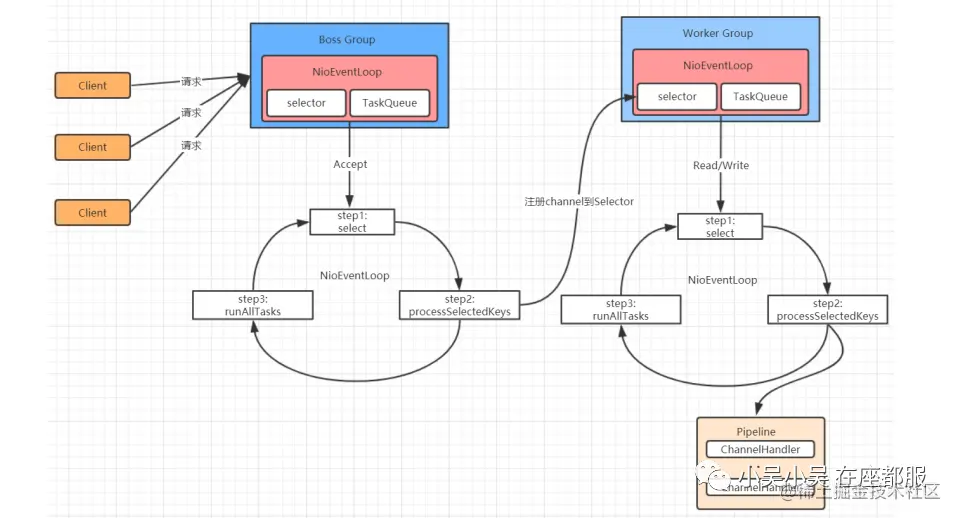WorkerEventLoopGroup 会由 next 选择其中一个 EventLoopGroup 来将这个 SocketChannel 注册到其维护的 Selector 并对其后续的 IO 事件进行处理