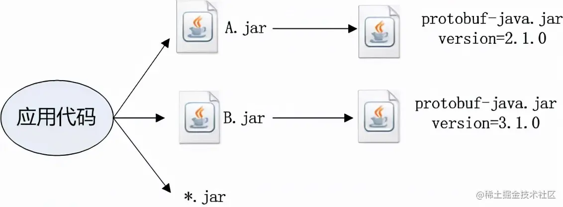 如上图假设应用系统同时依赖A.jar,B.jar,而A.jar,B.jar都依赖protobuf-java,系统运行时都会分别用到A.jar,B.jar中protobuf部分的功能,而且A.jar,B.jar依赖的protobuf版本无法通过升高降低版本调整到一致。由于protobuf-java3.0版本序列化协议,类内容各方面都不兼容protobuf-java2.0版本。这种情况无论如何调整依赖都无法解决冲突的问题,要解决这种冲突,请继续往下看,第五第六章内容。