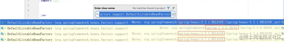 上例中通过搜寻可以发现spring-beans-3.2.1.RELEASE.jar,spring-2.5.6.SEC03.jar两个版本DefaultListableBeanFactory类及父类中没有"getDependencyComparator()Ljava/util/Comparator"方法,spring-beans-4.2.4.RELEASE.jar,spring-beans-4.3.5.RELEASE.jar两个版本DefaultListableBeanFactory类中有缺失的"getDependencyComparator()Ljava/util/Comparator"方法。