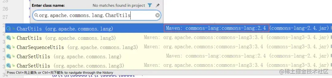 STEP3、在IDEA中(快捷键Ctrl+N)查找异常栈中提示缺失的类在哪些版本的jar包中有,如上例中的org.apache.commons.lang.CharUtils
