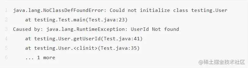 STEP1、发生NoClassDefFoundError首先要看完整异常栈,确认是否是静态代码块发生异常,静态代码块发生异常堆栈与jar包冲突有很明显的区别,出现"Could not initialize"、"Caused by: ..."关键字一般是静态代码块发生异常导致类加载失败: