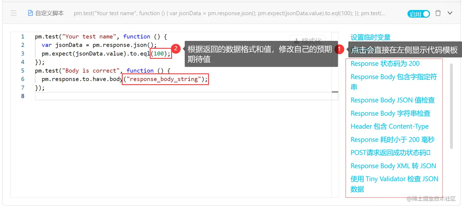 如果需要灵活设置断言,可以使用apifox里的后置操作中的自定义脚本功能,它也提供了代码模板功能,测试人员只需修改期待值即可。