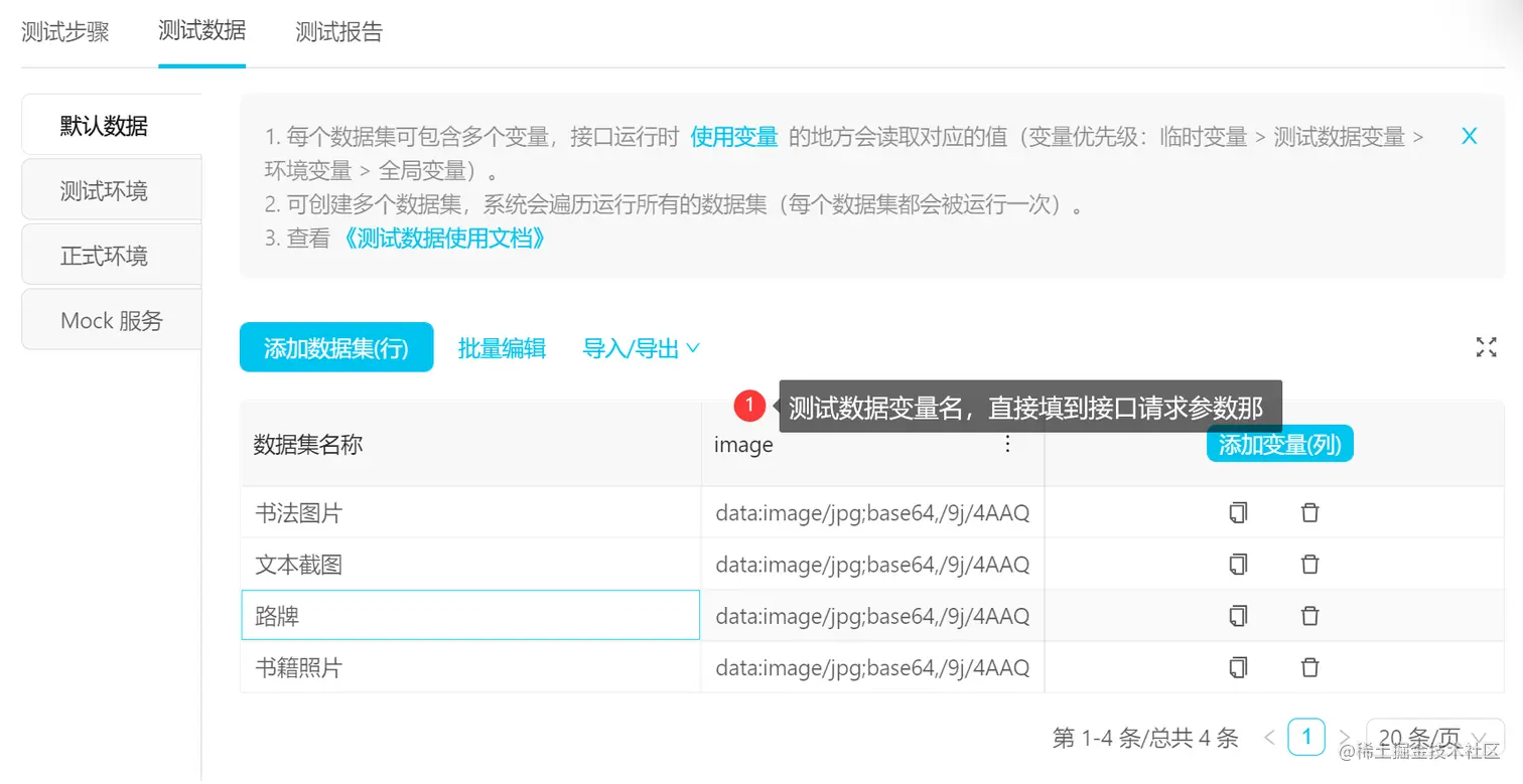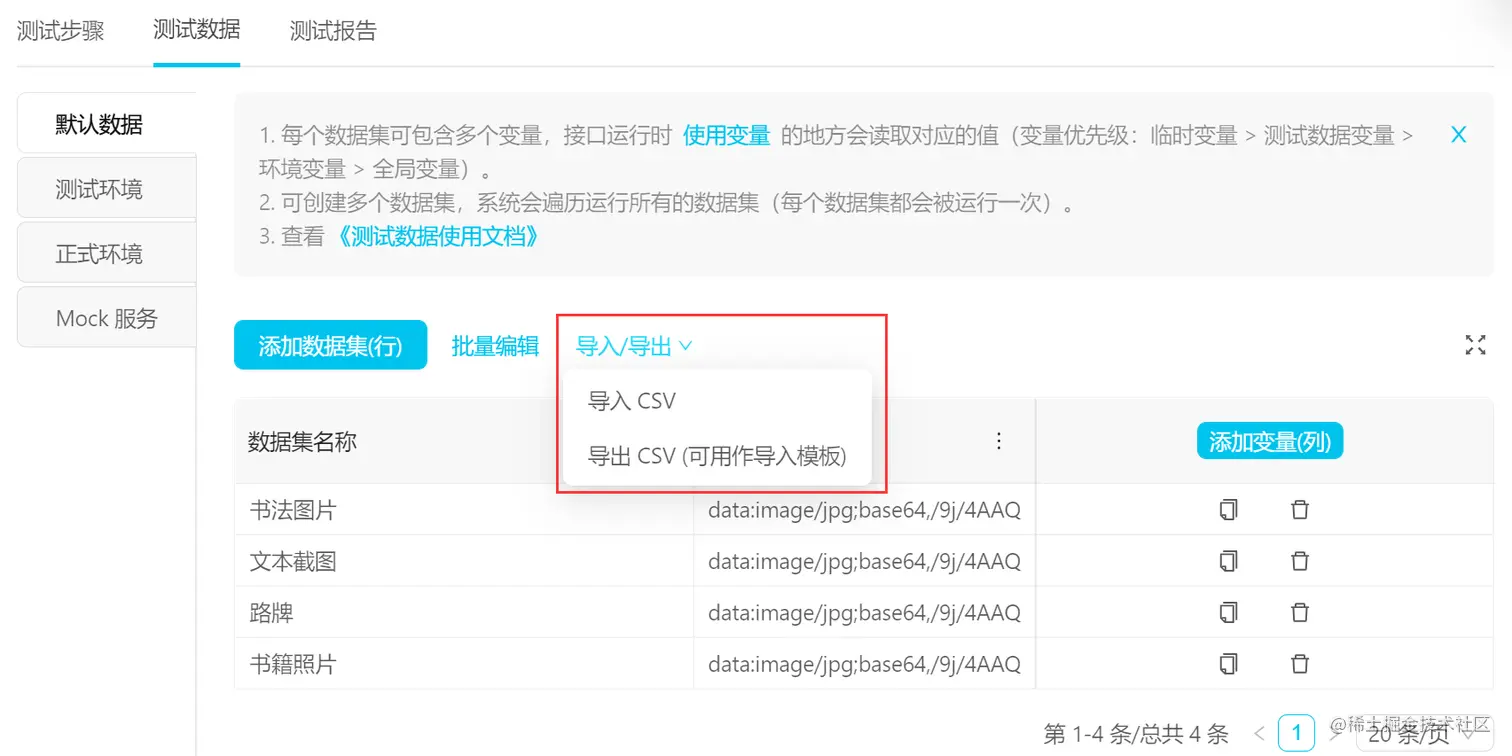 使用测试数据集 当我们需要上传不同的测试数据以校验响应返回数据是否存在异常时,一个接口参数需要多个测试数据。这个我们放到后面测试管理的部分谈。