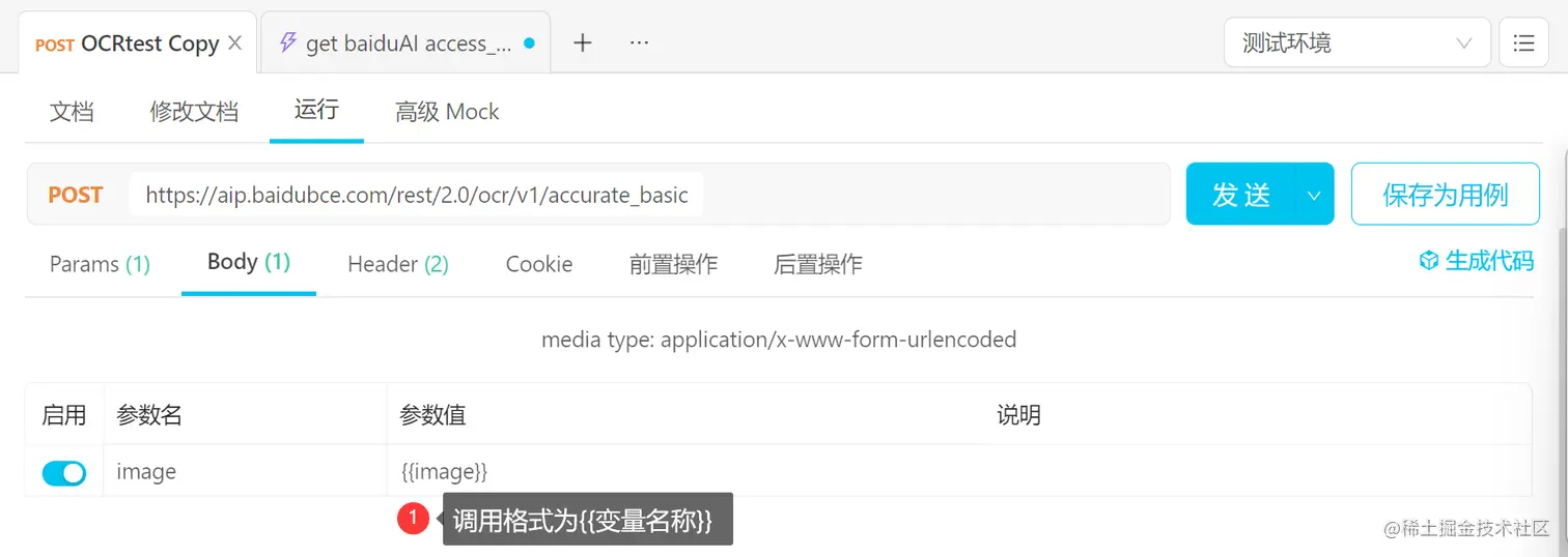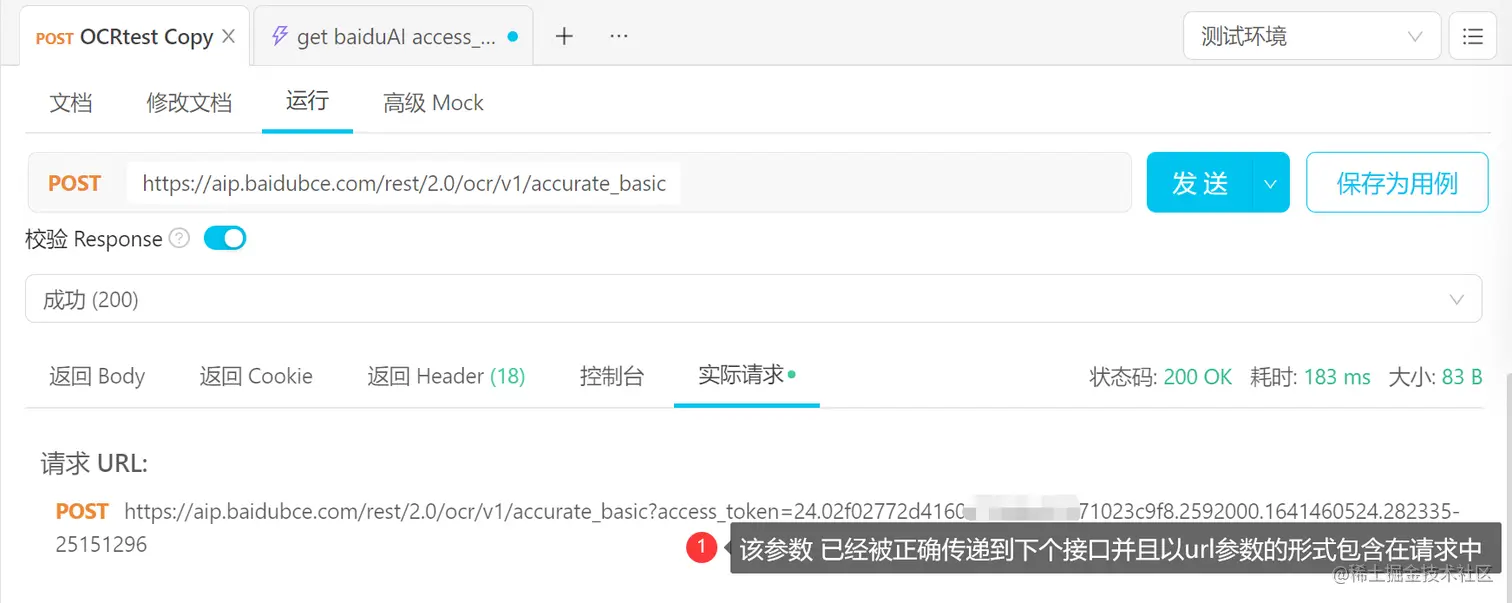 看一下结果: 发送该post请求,在接口>运行>实际请求tab>请求URL中可以看到,该参数已被成功调用