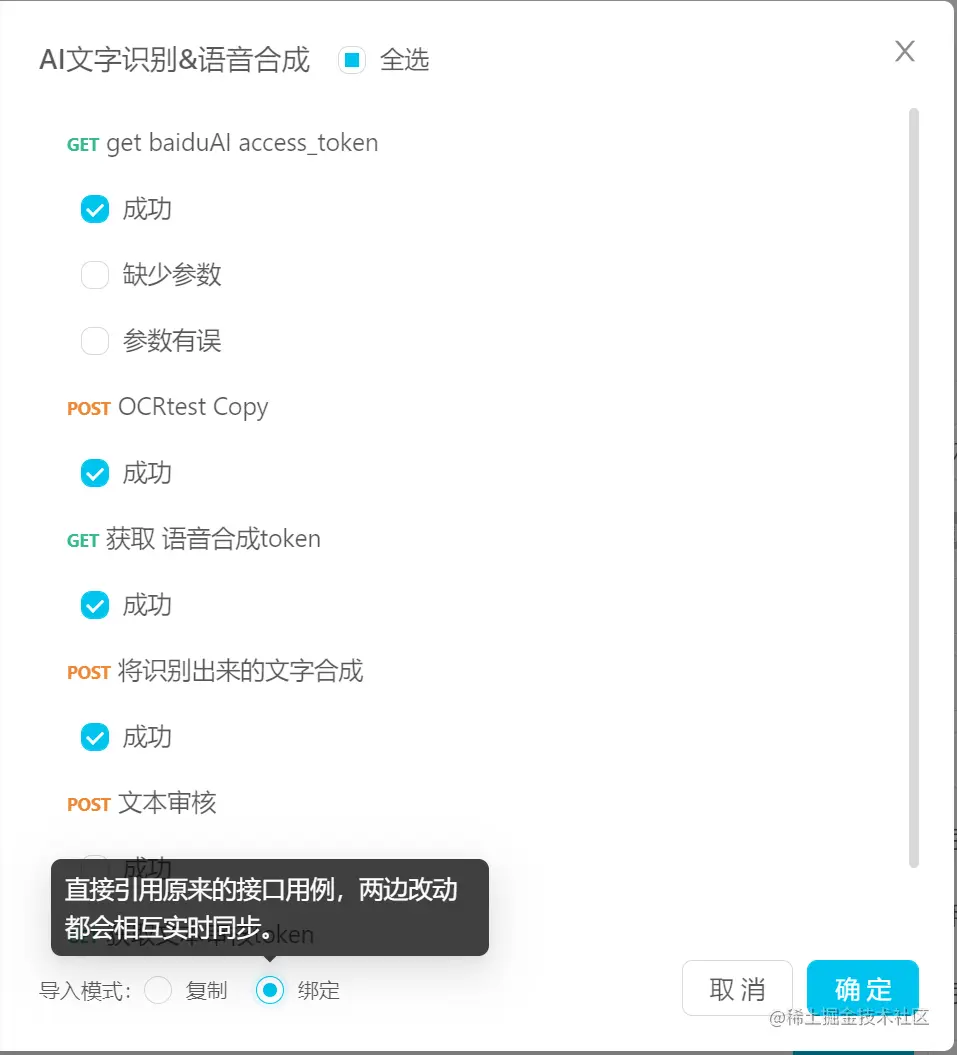 在测试管理tab,新建测试用例>导入接口用例>选择该测试场景所需用例>默认选择绑定>确定导入