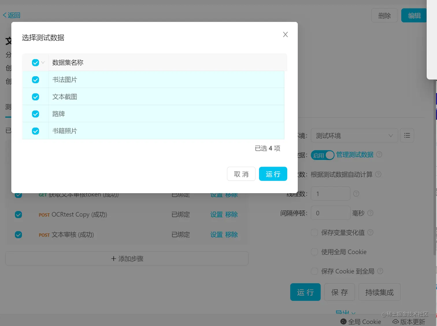 点击下方的运行按钮时,会弹出界面让测试人员选择要用的测试数据集,每个测试数据集都会当成一条测试用例来运行。