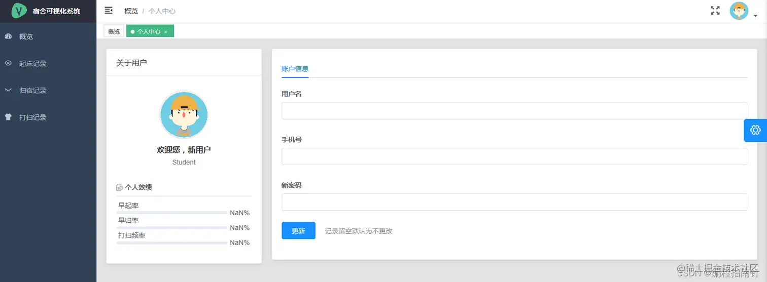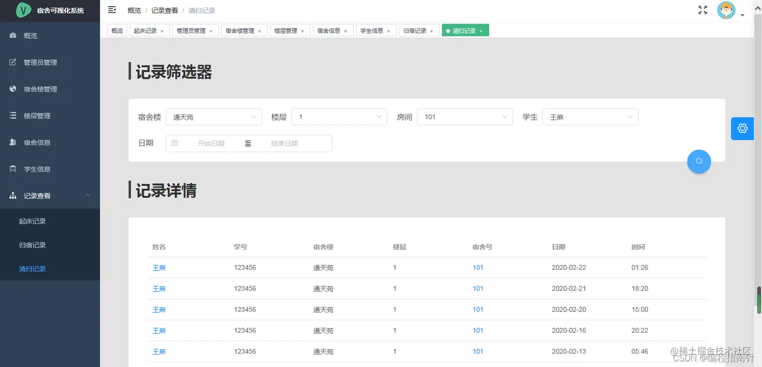 - 打扫记录(用于统计宿舍打扫频率)