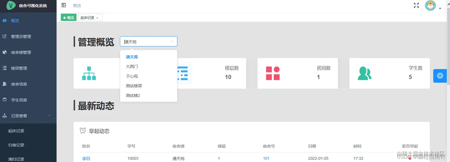 仪表盘概揽:选择不同的宿舍楼查看相关信息