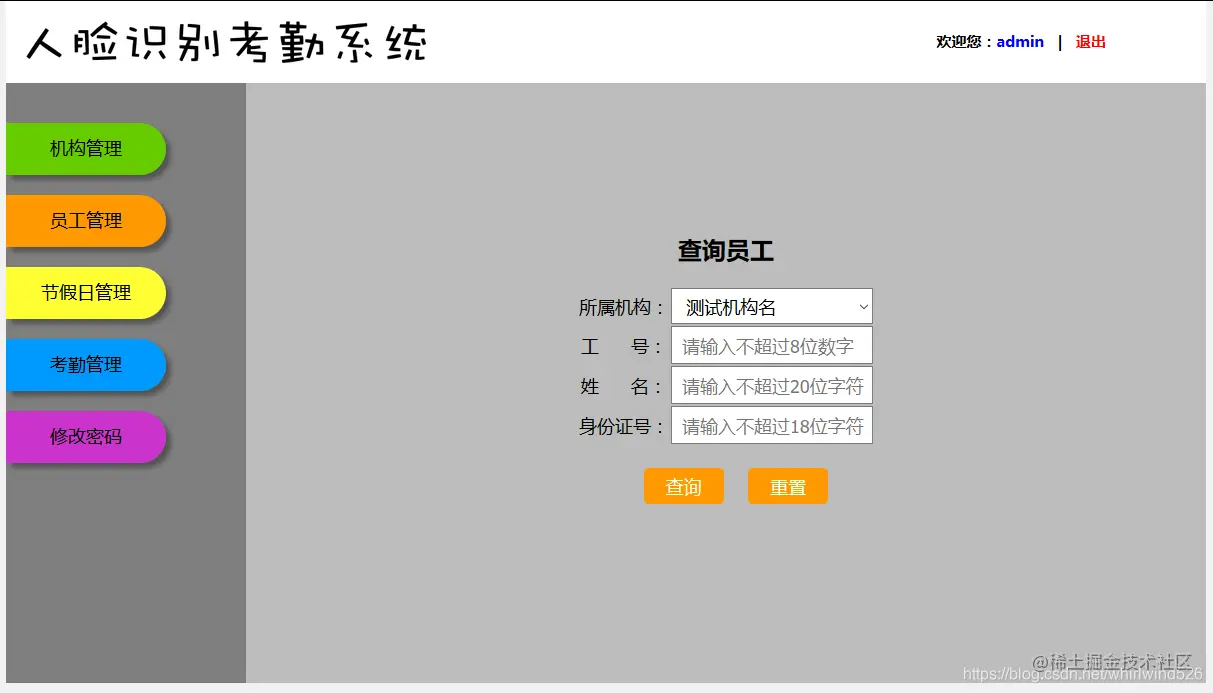 12. 点击【员工管理】,进入查询员工页面。选择刚添加的机构,点击【查询】按钮。如下图: