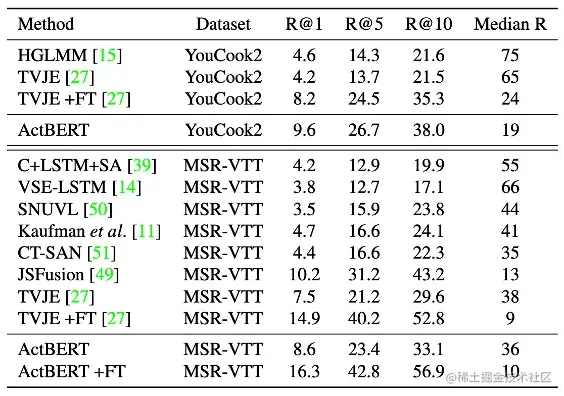 ActBERT是融合了视频、图像和文本的多模态预训练模型,它使用一种全新的纠缠编码模块从三个来源进行多模态特征学习,以增强两个视觉输入和语言之间的互动功能。该纠缠编码模块,在全局动作信息的指导下,对语言模型注入了视觉信息,并将语言信息整合到视觉模型中。纠缠编码器动态选择合适的上下文以促进目标预测。简单来说,纠缠编码器利用动作信息催化局部区域与文字的相互关联。在文本视频检索、视频描述、视频问答等5个下游任务上,ActBERT均明显优于其他方法。下表展示了ActBERT模型在文本视频检索数据集MSR-VTT上的性能表现。