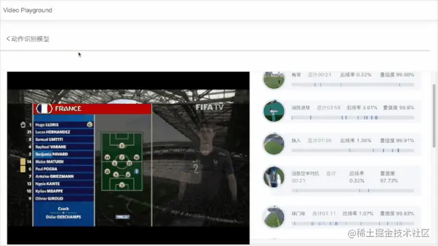 FootballAction基于行为识别PP-TSM模型、视频动作定位BMN模型和序列模型AttentionLSTM组合得到,不仅能准确识别出动作的类型,而且能精确定位出该动作发生的起止时间。目前能识别的动作类别有8个,包含:背景、进球、角球、任意球、黄牌、红牌、换人、界外球。准确率超过90%。