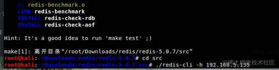 编译完成,进入下级目录src,启动redis客户端 远程连接靶机(默认无密码)