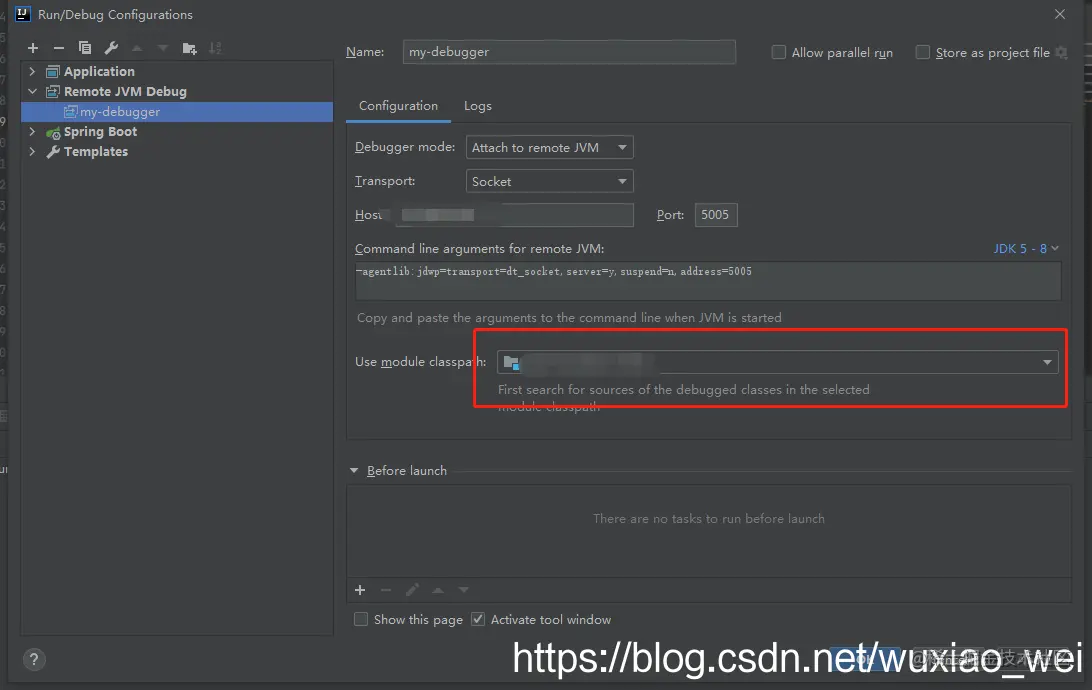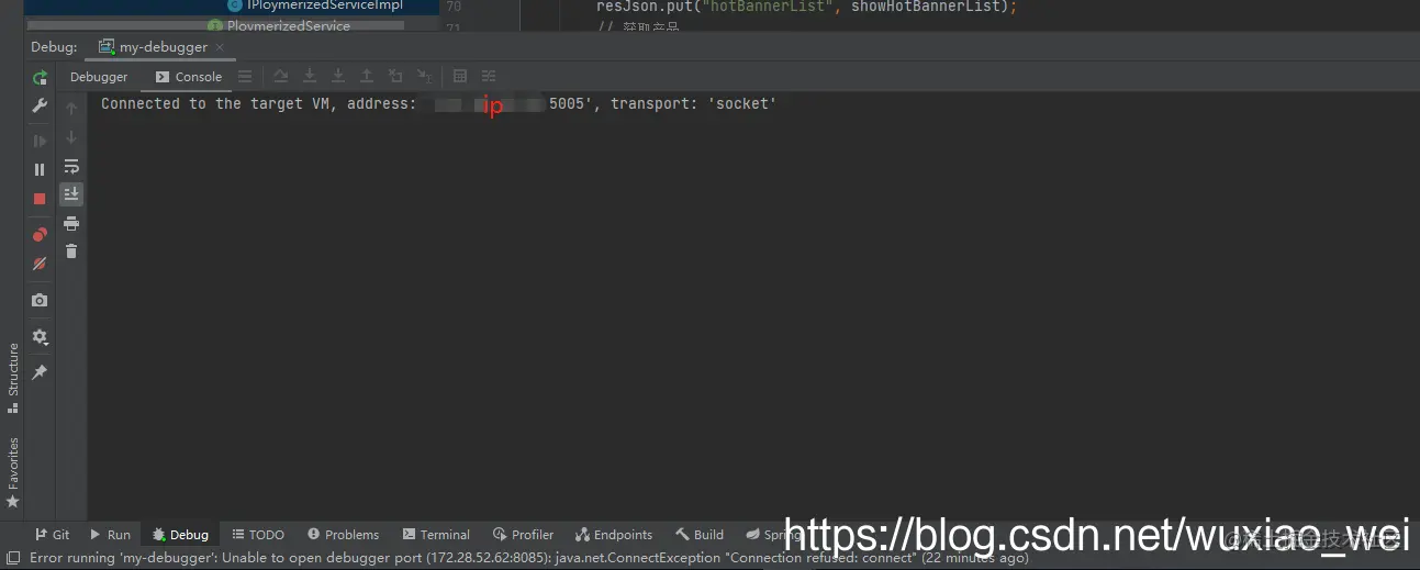 其实就是通过jvm的socket通信将线上与本地连接在一起,本地通过监听配置的端口上从而实现本地debugger.