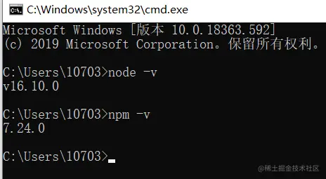 win+r:cmd进入命令提示符窗口,分别输入以下命令查看node和npm的版本能够正常显示版本号,则安装成功: