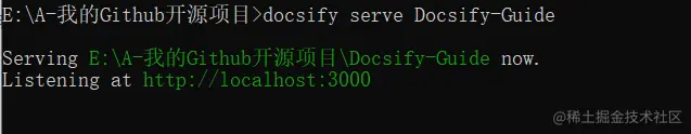 docsify serve 项目名称启动一个本地服务器,可以方便地实时预览效果。默认访问地址 http://localhost:3000 。