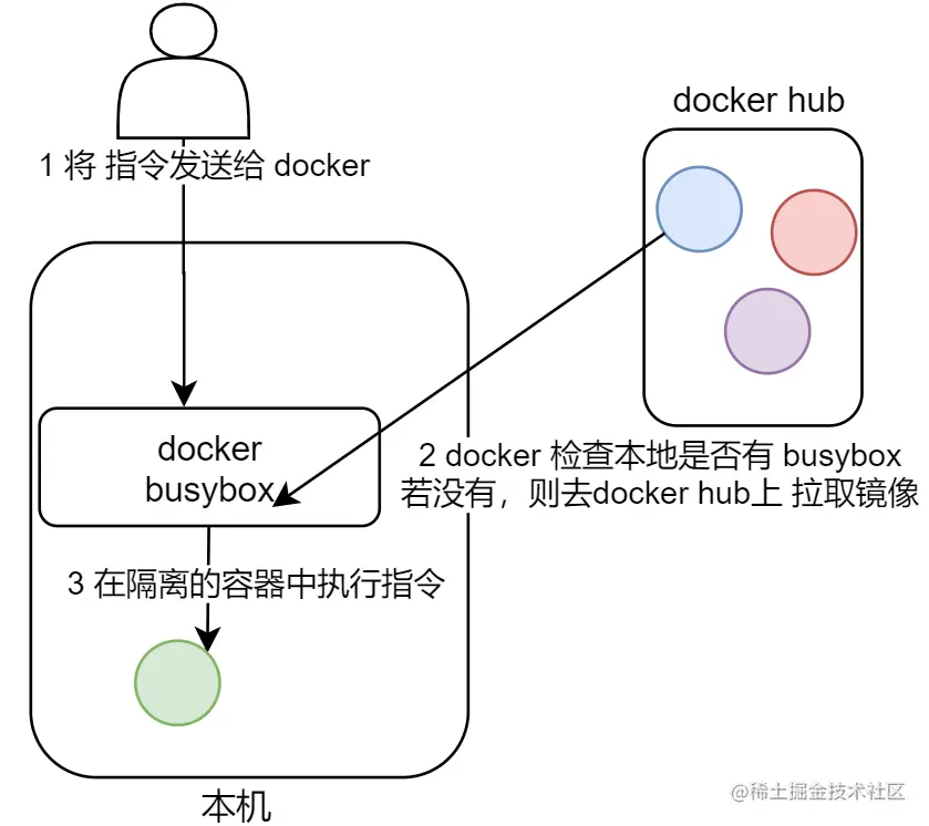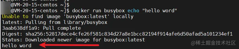 - docker 会检查本地是否有 busybox 镜像,若没有则去 docker hub 上面拉取镜像,并下载到本机,再基于这个镜像创建一个 容器