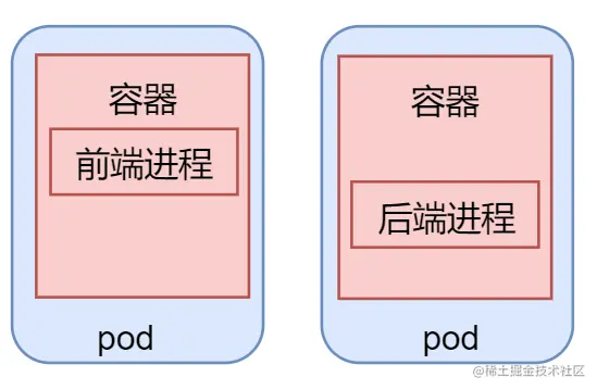 - 在 2 个 pod 中分别开 1 个容器,各自部署 前端,后台程序