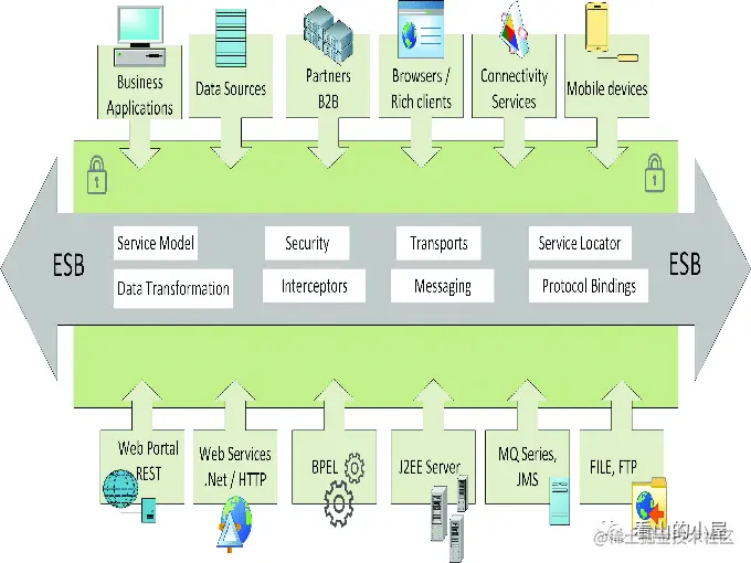 利用 ESB(Enterprise Service Bus,企业服务总线)实现各个子系统之间的通信交互;