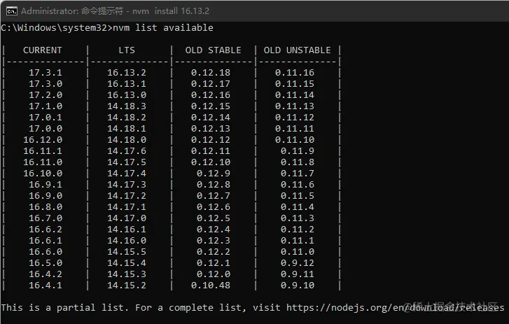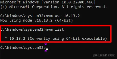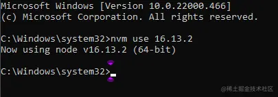 等待安装完成后记得切换版本nvm use 16.13.2如下所示:
