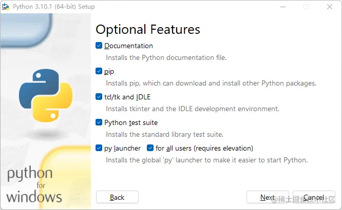 前往此处安装官方Python,选择适配自己系统的版本进行安装,一路下一步即可。这里我使用的是Python3.10.1最新版