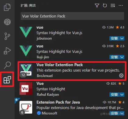 点击左侧最后一个Icon打开拓展面板,然后搜索Vue Volar Extention Pack安装推荐拓展(如果你打算纯手敲,不依靠插件也是可以的!):