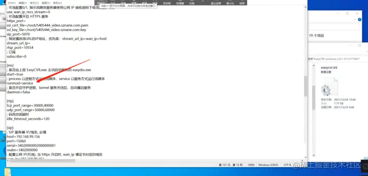 确定是这个原因后,又再次尝试重启服务,发现内核依然没有启动起来。接着进行深入排查,发现在easycvr.ini里,流媒体配置的是以进程方式运行,如图: