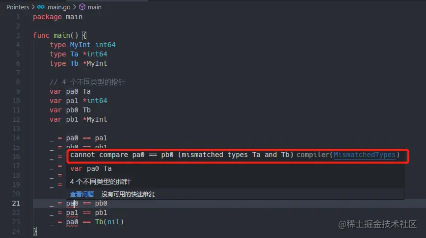 Go指针值是支持(使用比较运算符==和!=)比较的。 但是,两个指针只有在下列任一条件被满足的时候才可以比较: