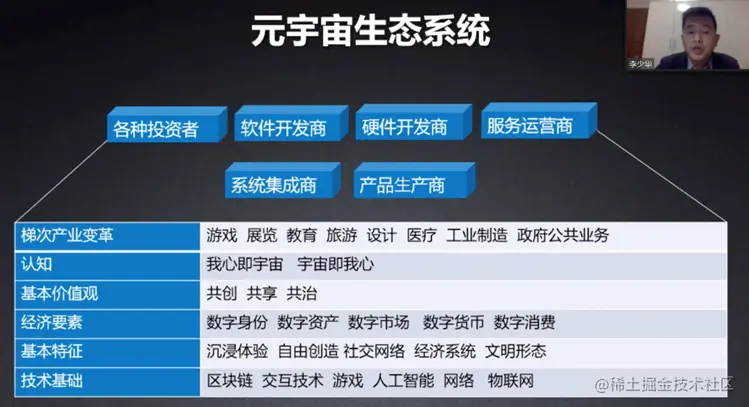 元宇宙生态系统,由各种投资者、软件开发者、硬件开发商、服务运营商、系统集成商、产品生产商组成。而生态系统中又包含很多基础概念,下面具体介绍一下这些概念的基础情况。
