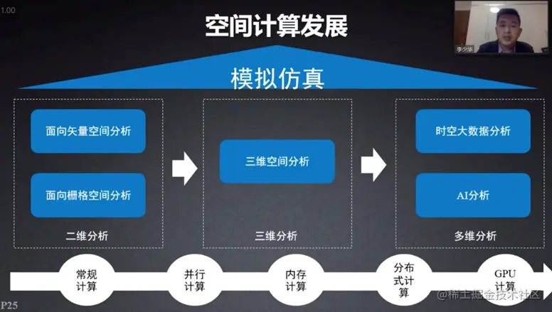 空间计算的发展进程,第一阶段是常规计算,然后发展为并行计算-内存计算-分布式计算,再到CPU计算,也可以从维度上进行划分,从二维分析,利用面向矢量空间分析、面向栅格空间分析到三维分析,再到多维分析,利用时空大数据和AI进行分析。