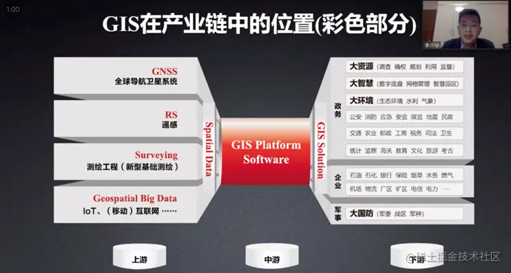 不仅是对普通用户,GIS 更多是行业应用,在整个产业链中,都有自己的角色用途。比如在产业链上游,GIS 可以应用到GNSS(全球导航卫星系统)、RS(遥感)、工程测绘(新型基础测绘)、IoT、移动互联网等众多场景中。再比如在产业链下游,GIS 可以应用到军事(军委、战区、军种)、企业(石油、银行、保险、烟草、水务、燃气、机场、物流、厂区、矿区、电信、电力等)、政务(公安、消防、应急、安监、地震、交通、农业、邮政、卫生、教育、文化、旅游、考古等)。