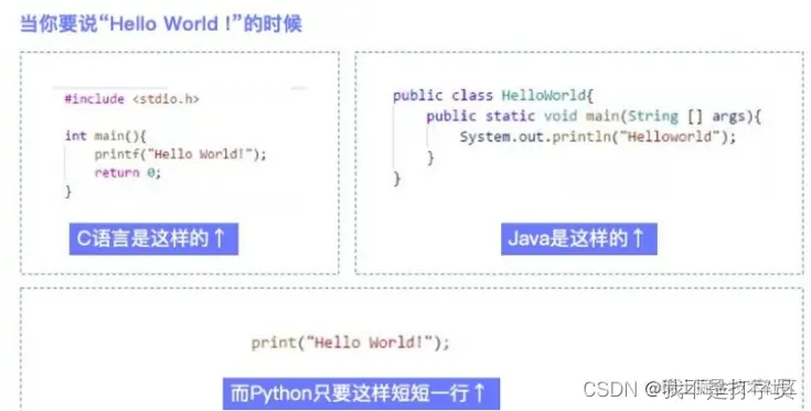 举个例子,分别用C语言、Java、Python来打印“Hello Word”。