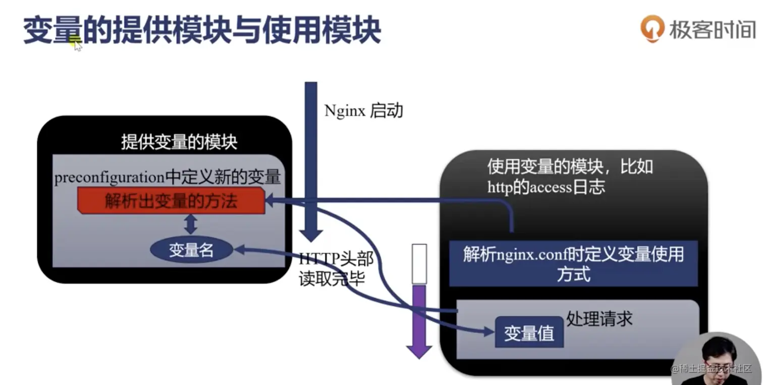 - 有一个回调方法叫preconfiguration,该回调方法在读取config文件之前,开始定义变量,比如我们经常使用的remote_addr等变量,它会定义出一对变量:解析变量的方法、变量名。该变量方法可以获取到变量的值。