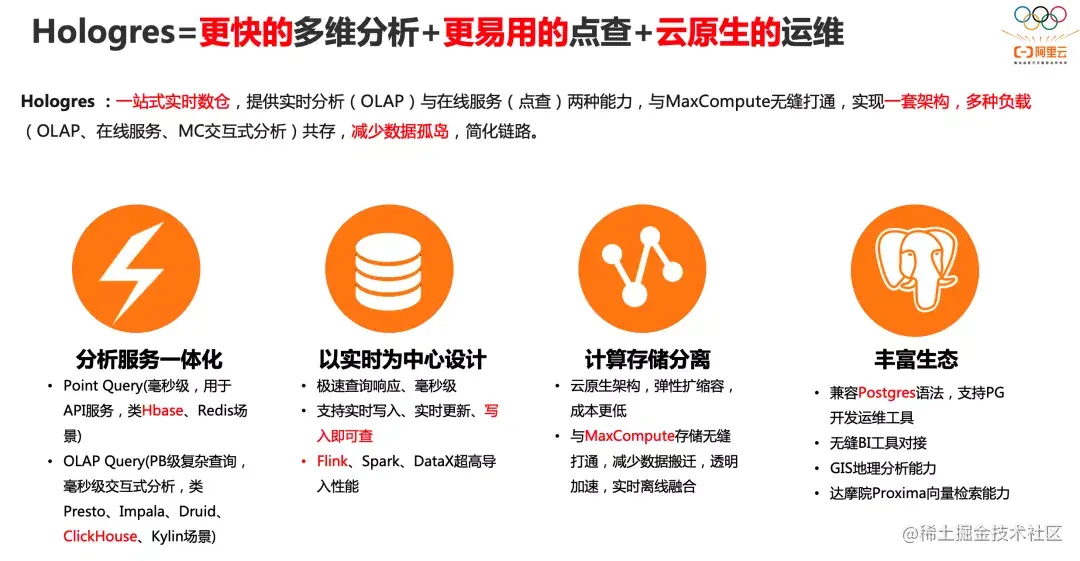 Hologres从设计之初就考虑了这两点。Hologres完全兼容了PostgreSQL 11的协议、语法、函数等,很多PostgreSQL扩展(例如PostGIS)可以直接使用。同时,Hologres提供了完整的主键概念和强大的更新能力,并提供了单SQL的ACID。今年双11,有业务测得了每秒350万+的实时写入更新性能。这些能力极大的放宽了实时数仓的应用场景,将传统由NoSQL和RDS承载的场景改由实时数仓来承载,为用户提供了更加强大的分析处理工具。