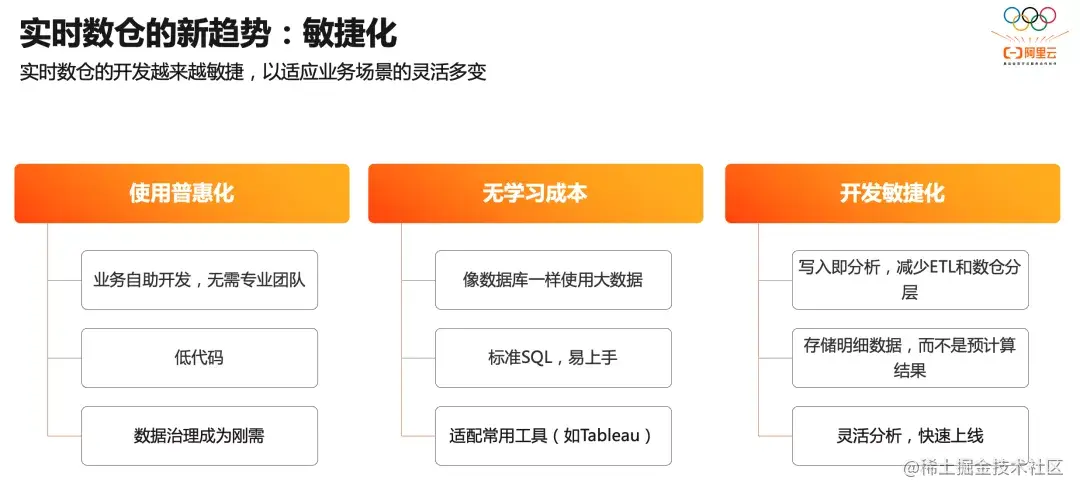 最后一个趋势是开发方法论上的变化,实时数仓的开发越来越敏捷,以适应分析场景的灵活多变。
