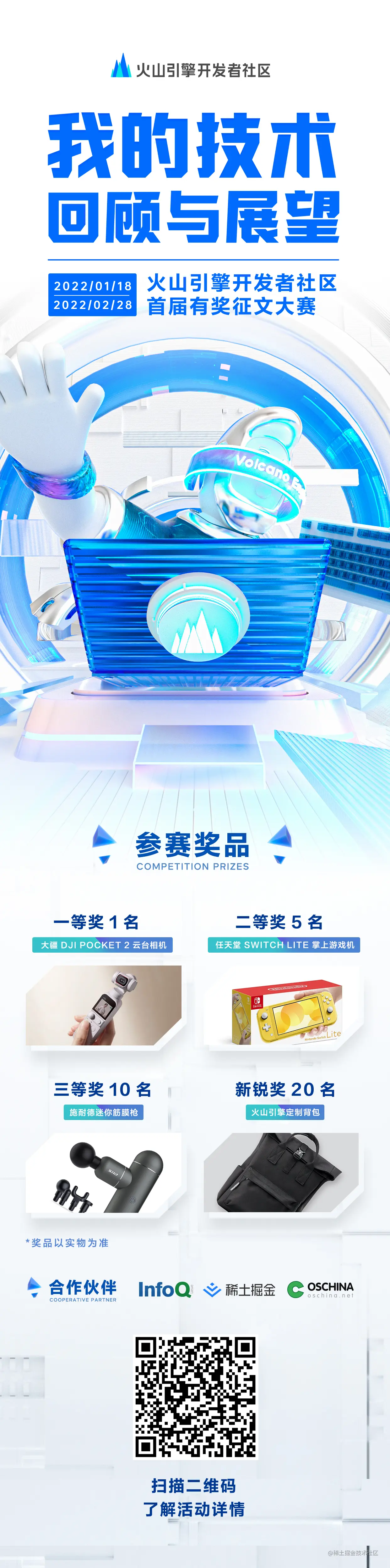 优秀获奖作品将推荐到 火山引擎 开发者社区网站首页「精彩文章」展示,同时还有机会在【火山引擎开发者社区】公众号发布。